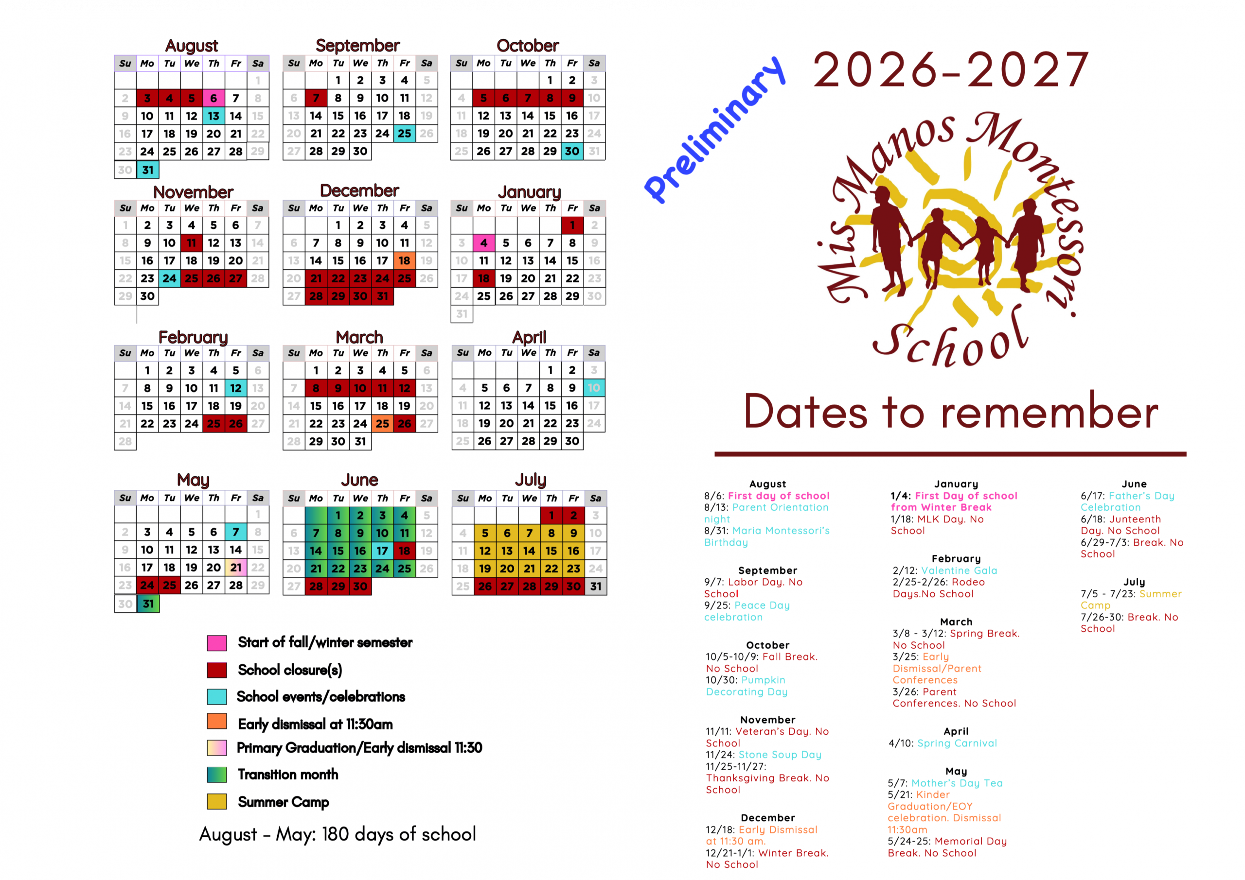 Mis Manos Montessori School is a year-round program with summer as an option. In registering your child, and signing the enrollment contract, you agree to pay monthly tuition for a full school year. If a need arises and a child must leave the school, tuition is due for the remaining portion of the contract from the date signed. If the school is able to fill your child’s position, then the tuition obligation will be released.